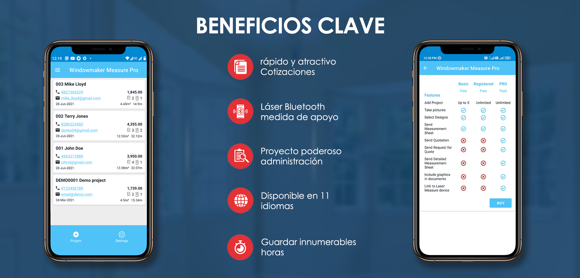 Utilice dispositivos láser para almacenar instantáneamente medidas en su teléfono inteligente. Envíe presupuestos en el lugar.