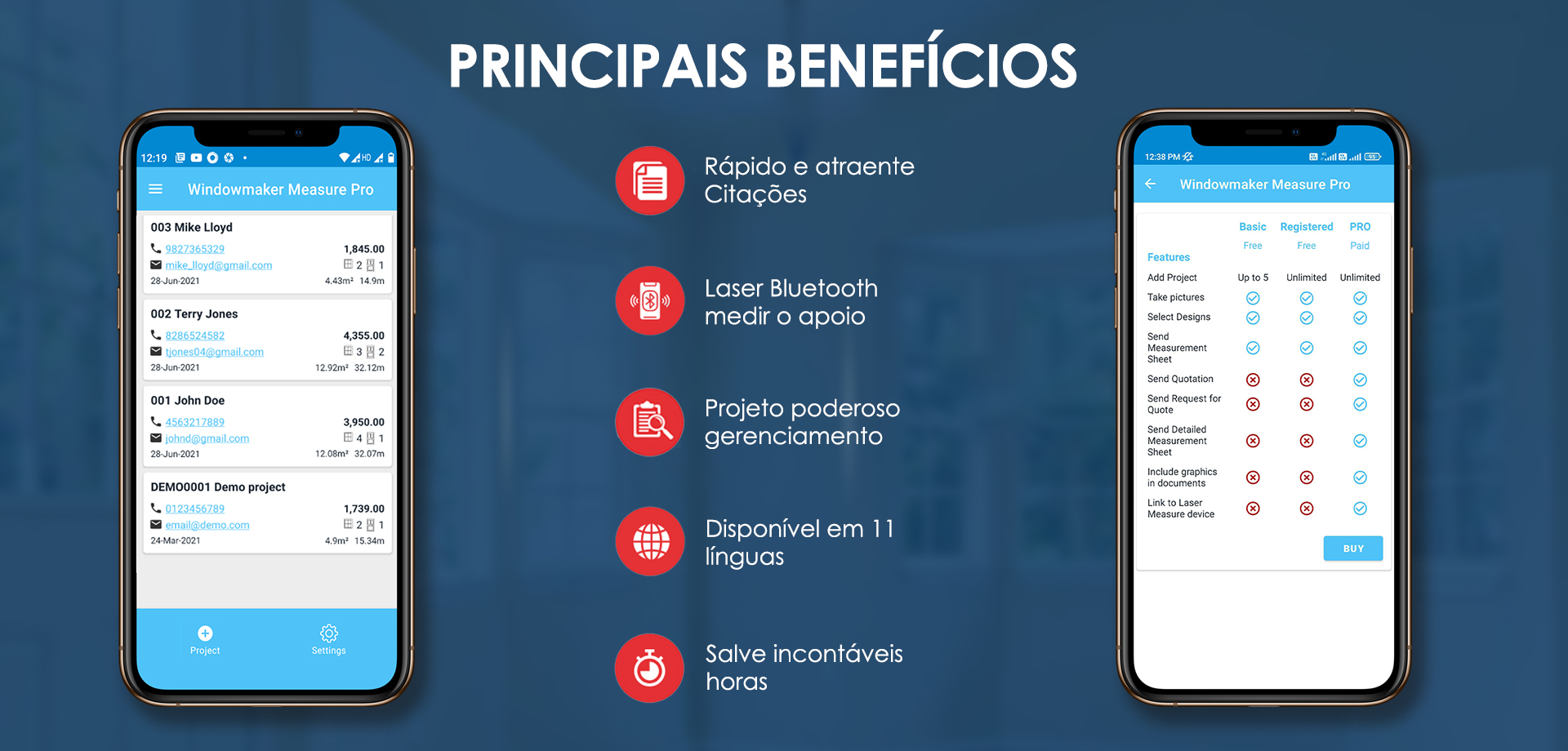 Utilize dispositivos a laser para armazenar medidas instantaneamente no seu aparelho. Envie orçamentos no local.